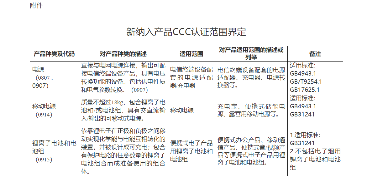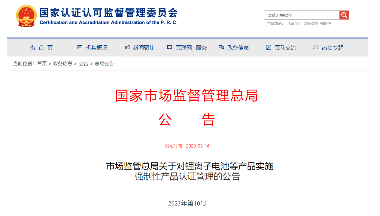 In accordance with the relevant requirements of the Opinions of The General Office of the State Council on Deepening the Reform of the Management System of the Electronic and Electrical Appliances Industry (No. 31 (2022)), The State Administration for Market Regulation has decided to implement mandatory product certification (CCC certification) management on lithium-ion batteries and battery packs, mobile power supplies and power adapters/chargers for telecommunication terminal products (hereinafter referred to as the newly included products) used in electronic and electrical products. Relevant requirements are hereby announced as follows: